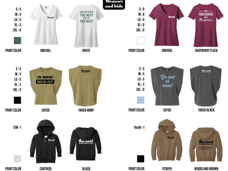 Screen printing shirt mockup for The Nest breakfast restaurant in Atascadero