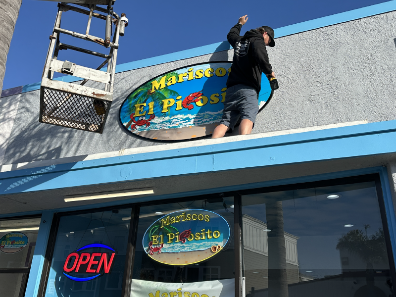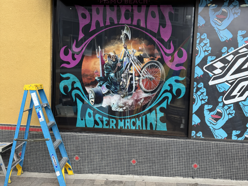 Pancho's Surf Shop window graphic in Pismo Beach, CA